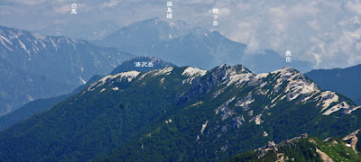 残念ながら笠ヶ岳(2897m)は雲に隠れているが、他の山々は雲の下に見える。昨日といい今日といい飛騨山脈は雲が多いなあ。それともそのお陰で常念山脈は晴天率が高いのだろうか。